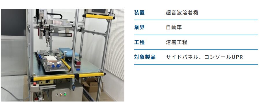 自動車業界における溶着工程において超音波溶着機を導入した事例です。 こちらのお客様はサイドパネルやコンソールUPRなどの自動車部品に必要な溶着工程を人力で行っておりました。 そのため、品質のばらつきが生まれてしまう他、作業者のひじに負担がかかるという課題がありました。